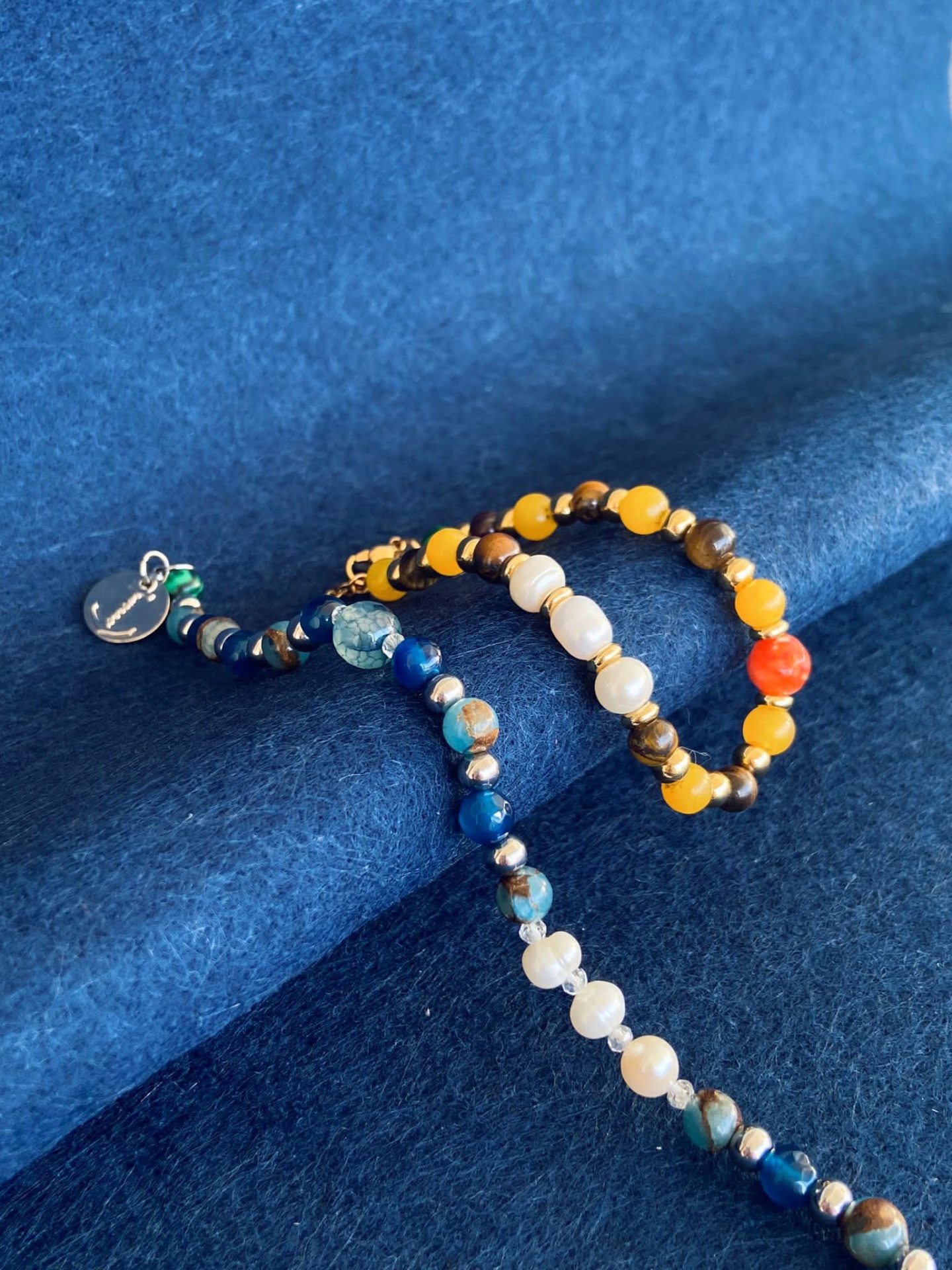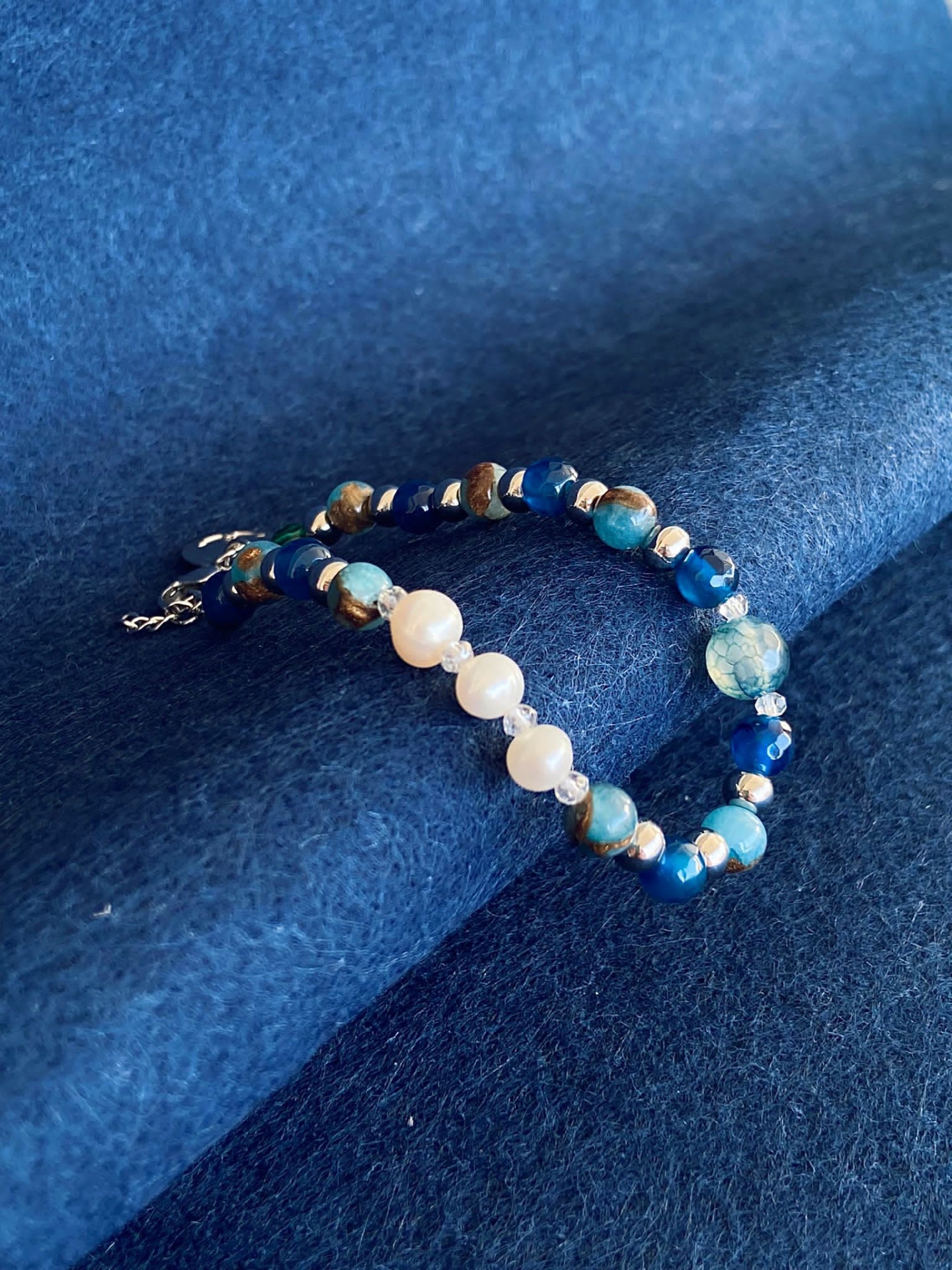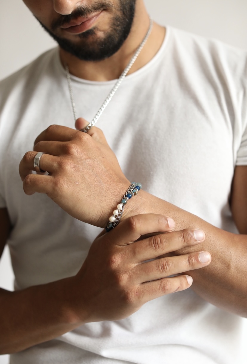 OCEAN Natural Stones Bracelet 24,95 € Desconto de %. Partilhar Size 21cm (Universal) 19cm 23cm Comprar Contactar • Natural Stones Bracelet • 3 Pearl Natural Stones• 1 Blue Aventurine Natural Stone• Lapis Lazuli Natural Stones• Piersite Natural Stones• 4 Small Glass Stones• Premium Stainless Steel 316L Balls• Premium Stainless Steel 316L Troppo Dettagli Pendant